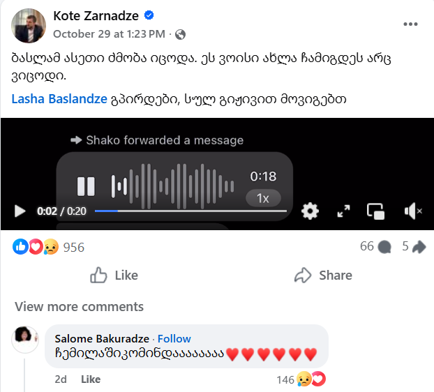 ბასლამ ასეთი ძმობა იცოდა. ეს “ვოისი” ახლა ჩამიგდეს, არც ვიცოდი. ლაშა ბასლანძე გპირდები, სულ გიჟივით მოვიგებთ” – ამის შესახებ საკრებულოს გარემოს დაცვის კომისიის თავმჯდომარე კოტე ზარნაძე სოციალურ ქსელში წერს და აუდიოჩანაწერს აქვეყნებს.